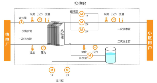 換熱站作為集中供熱的核心設(shè)備,由其他固定供給點(diǎn)提供熱源(如電廠),利用板式換熱器加熱二次供水,用循環(huán)泵循環(huán)熱水,補(bǔ)水泵補(bǔ)水穩(wěn)定,是集中供熱的核心設(shè)備。