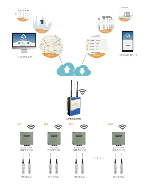 大壩測(cè)漏系統(tǒng)為典型物聯(lián)網(wǎng)應(yīng)用,壩體安裝的MPM4700智能液位變送器(滲壓計(jì))作為感知層設(shè)備,Earth1004遠(yuǎn)程監(jiān)測(cè)終端、Earth2000遠(yuǎn)程測(cè)控終端為網(wǎng)絡(luò)層設(shè)備,大數(shù)據(jù)平臺(tái)作為應(yīng)用層,形成了一套有機(jī)整體,拓?fù)鋺?yīng)用見下圖: