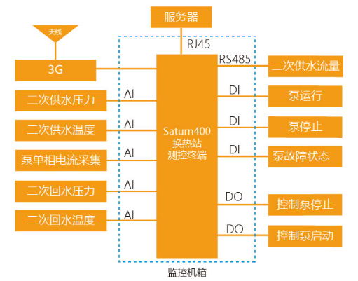 一次網(wǎng)監(jiān)測(cè)由Saturn400換熱站監(jiān)測(cè)終端負(fù)責(zé)一次回路數(shù)據(jù)的采集與執(zhí)行,并由Saturn400換熱站監(jiān)測(cè)終端負(fù)責(zé)上、下通訊,通過RJ45端口或3G與換熱站監(jiān)控中心、公司調(diào)度中心進(jìn)行通訊。其功能框圖見下圖所示: