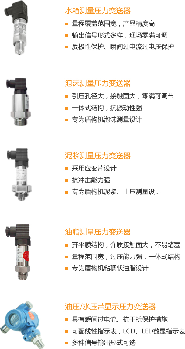 麥克傳感作為國內(nèi)傳感器行業(yè)的先行軍,利用已掌握的核心技術(shù),為盾構(gòu)機(jī)應(yīng)用量身定制一系列專用傳感元件,對整個設(shè)備的水箱、液壓油、土渣、泥漿、泡沫等介質(zhì)的壓力測量提供可靠穩(wěn)定的監(jiān)測。